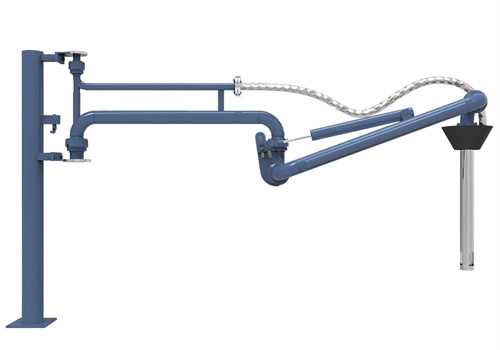 AL1412型頂部密閉裝卸臂(化工廠專用鶴管)由5個(gè)旋轉(zhuǎn)接組成回轉(zhuǎn)機(jī)構(gòu),液相4個(gè),氣相1個(gè)。氣相一般為DN50,液相根據(jù)客戶需要的流量選擇。氣相在轉(zhuǎn)接處使用金屬軟管連接,保證鶴管的旋轉(zhuǎn)靈活性。鶴管液相接口朝下,氣相接口朝上,一般氣相會(huì)多臺(tái)匯總在一個(gè)主管上,如果單臺(tái)排空的話,需要加帶雨帽的阻火器,防止管道進(jìn)入點(diǎn)燃源。垂管上有一個(gè)錐形密封帽,裝車時(shí)垂管插到槽車的頂部灌口,密封帽壓實(shí)在灌口處,鎖緊外臂鎖緊桿(或者氣缸壓緊,在和油氣回收配合使用時(shí),建議鶴管增加氣缸,達(dá)到充分密閉的作用,因?yàn)榭盏牟圮囋谘b車時(shí)物料逐漸增多,槽車輪胎壓扁,槽車降低,密封帽就不能很好的密封了,必須有氣缸對(duì)密封帽有一個(gè)壓力,才能使密封帽始終跟緊灌口。達(dá)到有效密閉的效果,油氣回收需要密閉效果達(dá)到90%-95%)密封帽密閉后,槽車?yán)餁饣慕橘|(zhì)就能通過鶴管上的氣相管道排空或者抽入油氣回收系統(tǒng)